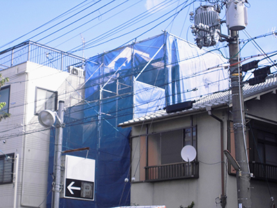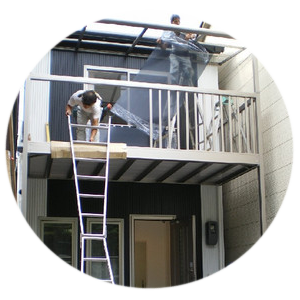 外壁塗装の際には、足場を組んで、まず外壁の洗浄から行います。足場を組む際に、音が出ますので、近隣へのご配慮が必要です。当社は工事前に近隣へのご説明もさせて頂きますので、ご安心ください。